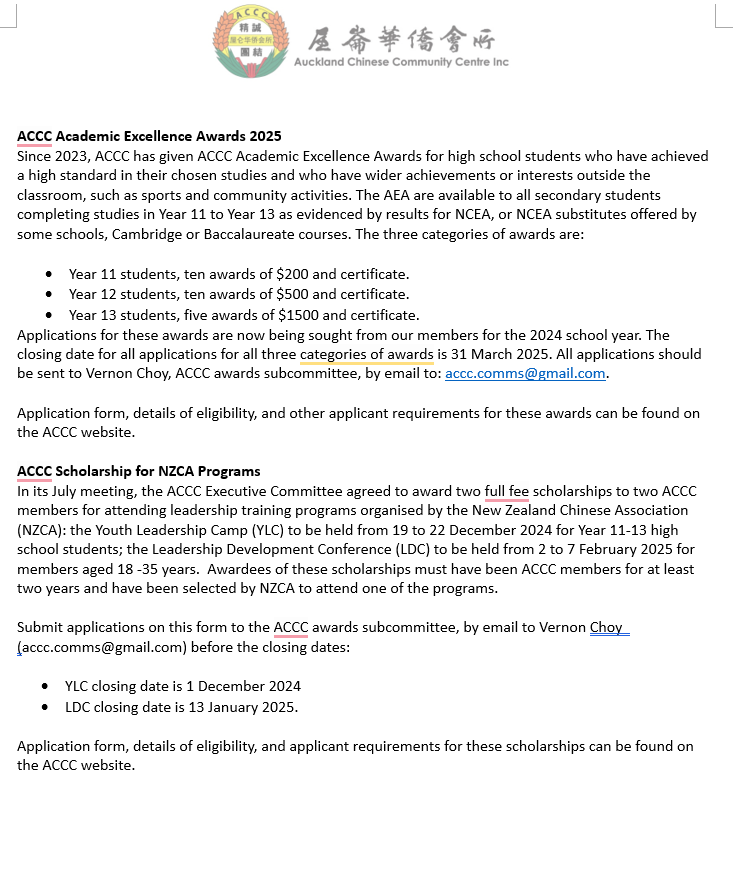 - Applicants must provide evidence of both academic achievement and community involvement / service / membership. Academic achievements can be Excellence Endorsement for NCEA or NCEA equivalent provided by a school or equivalent Cambridge or Baccalaureate courses of study. Community involvement can be within the Chinese or wider community. Evidence should include copies of academic transcripts, NZQA results, letters of recommendation and other outputs. It is helpful and meaningful, especially for Year 13 applicants, to provide full details in the Achievement sections rather than a bare list.