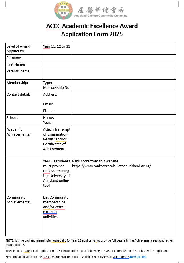 Application for these awards shall be made on the ACCC Academic Excellence Award application form and must be submitted before 31 March of the following year of study by the applicant. All applications with supporting papers should be emailed to the ACCC scholarships sub-committee, Vernon Choy, vj.choy@gmail.com.